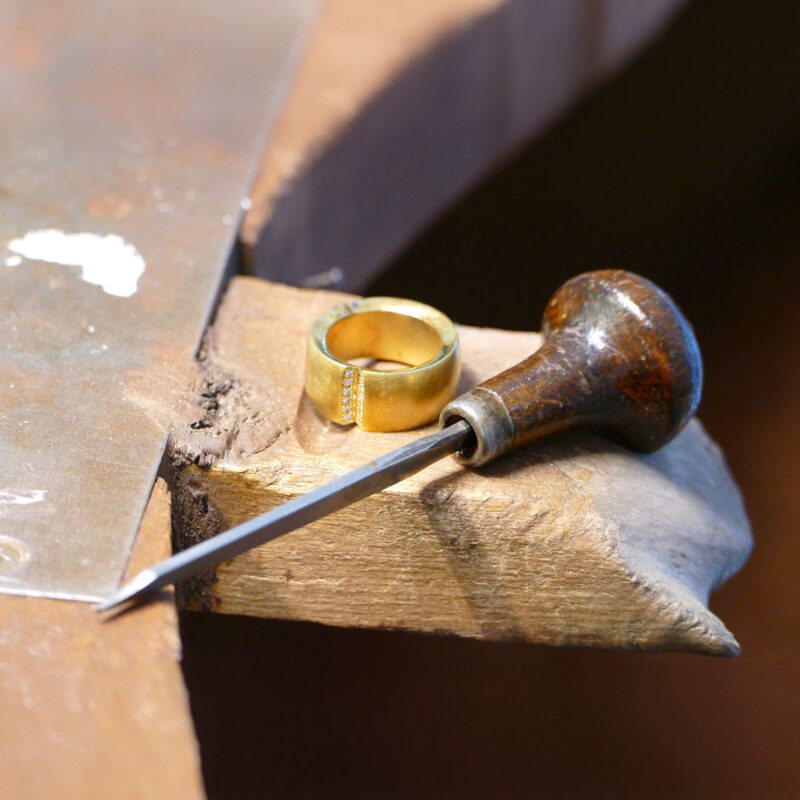 Im Gegensatz zu strich-, kreis- oder eismatt, gibt die Gestaltung mithilfe des Stichels dem Schmuck eine ganz andere Dimensionalität und ermöglicht vielseitige Strukturen.