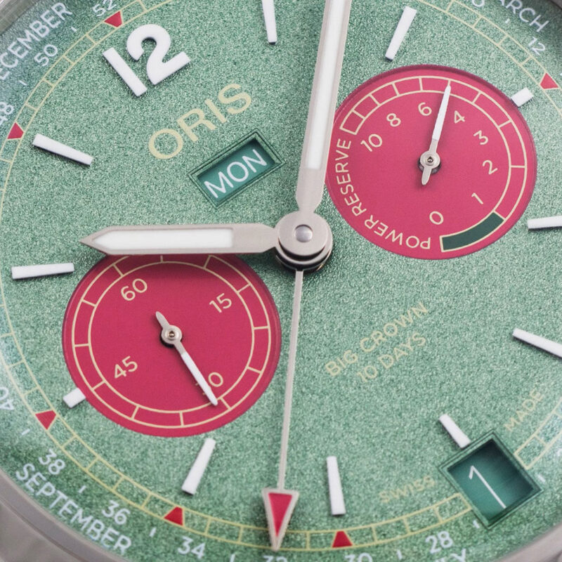 Das mintgrüne Zifferblatt mit den pinken Totalisatoren macht sie dabei zusätzlich alles andere als gewöhnlich.