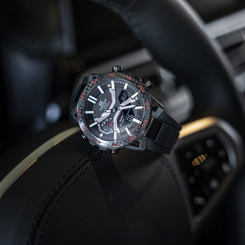Mit ihrem leichten Carbon-Design und der markanten Gehäuseform steht die ECB-2000er Serie von Edifice (by Casio) für moderne Performance.