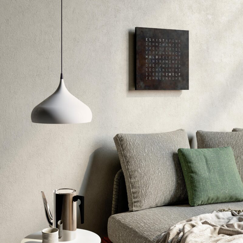 Die Qlocktwo lässt sich in verschiedenen Gehäusefarben und Materialien wählen von Holz über Metall bis Acryl und wird so zum individuellen Kunstwerk an Deiner Wand.